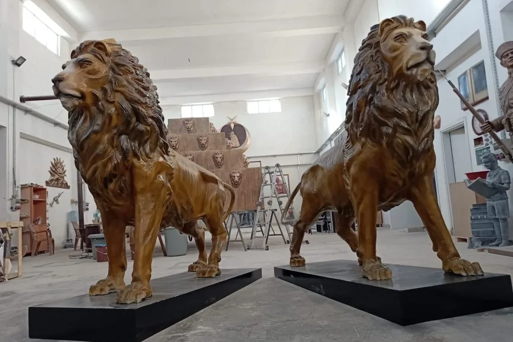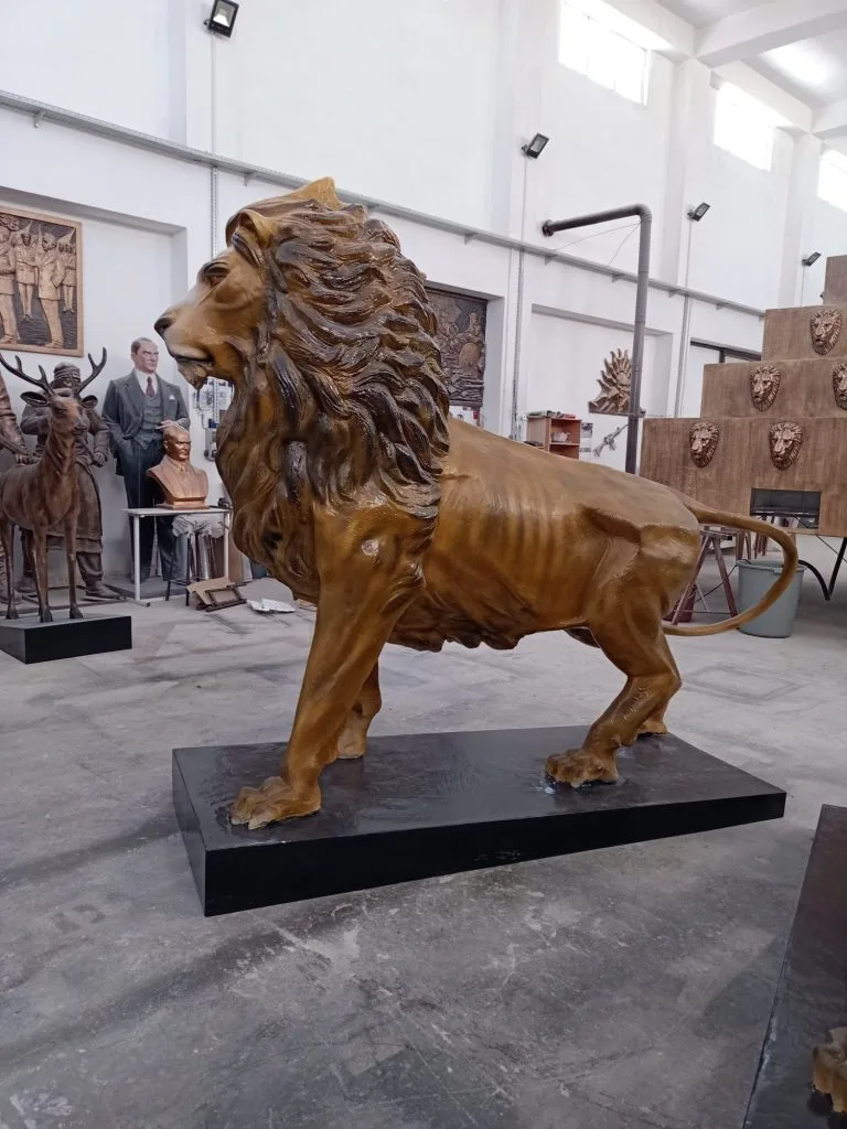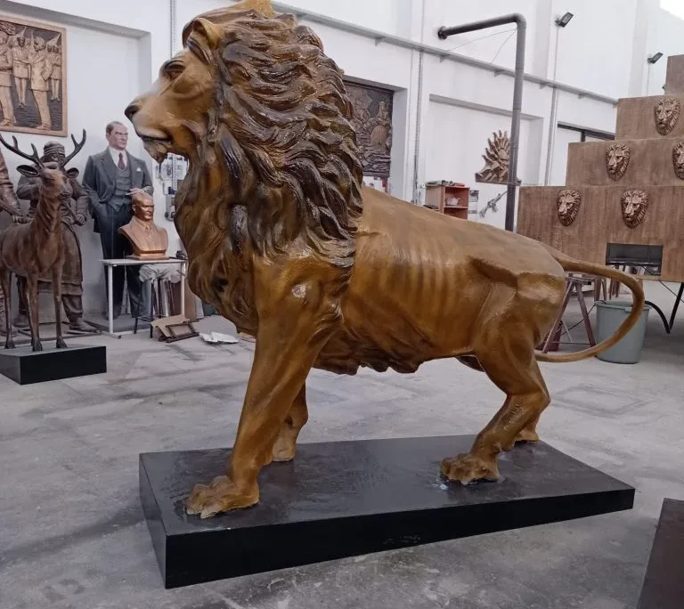 Güç, liderlik ve asaletin evrensel simgesi olan aslan figürü, bu anıt heykel çalışmasında etkileyici ve ihtişamlı bir kompozisyonla hayat bulmuştur.