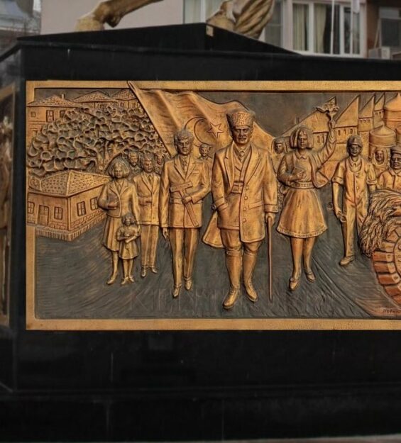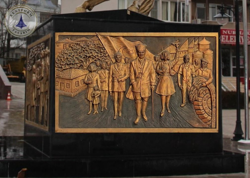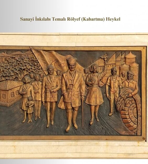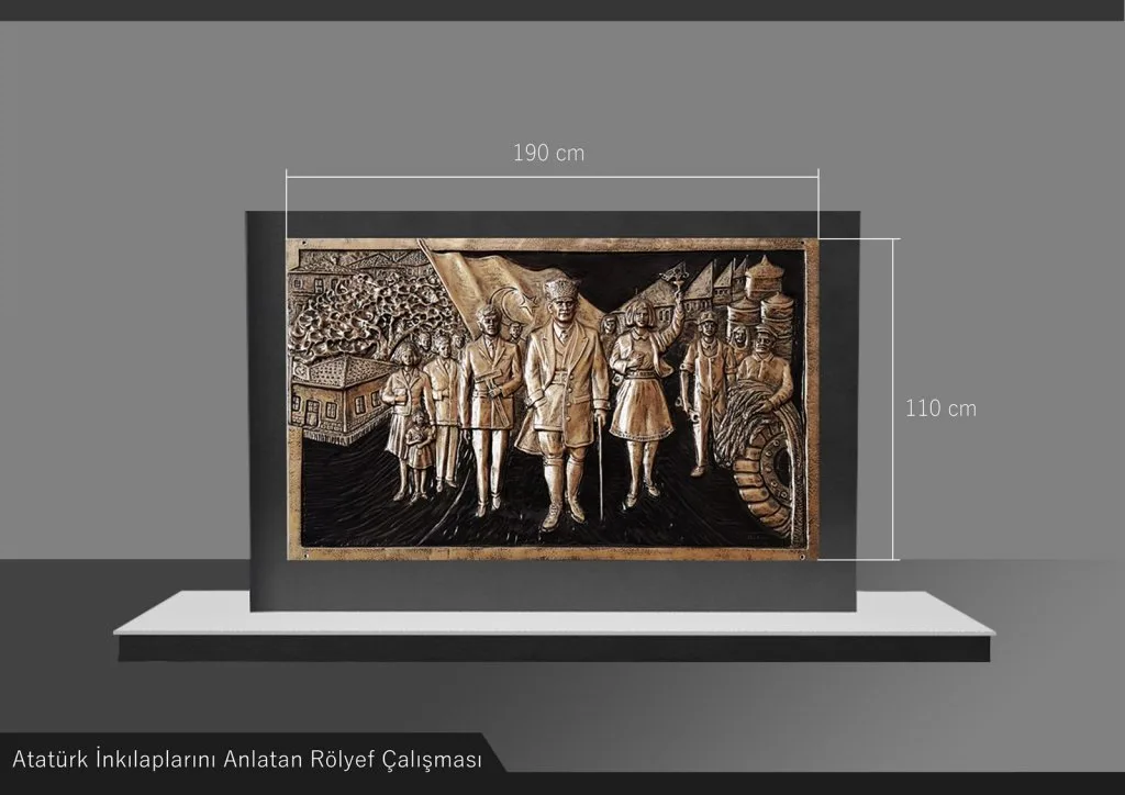 Cumhuriyetin kuruluş sürecini ve Atatürk inkılaplarını simgesel bir anlatımla ele alan bu özel rölyef çalışması, tarihsel bir hikâyeyi sanatsal bir kompozisyon içerisinde sunmaktadır. Merkezde yer alan Mustafa Kemal Atatürk figürü; liderlik, vizyon ve ilerleme anlayışını temsil ederken, çevresinde konumlanan figürler ve sahne detayları Cumhuriyetin dönüşüm sürecini betimlemektedir.