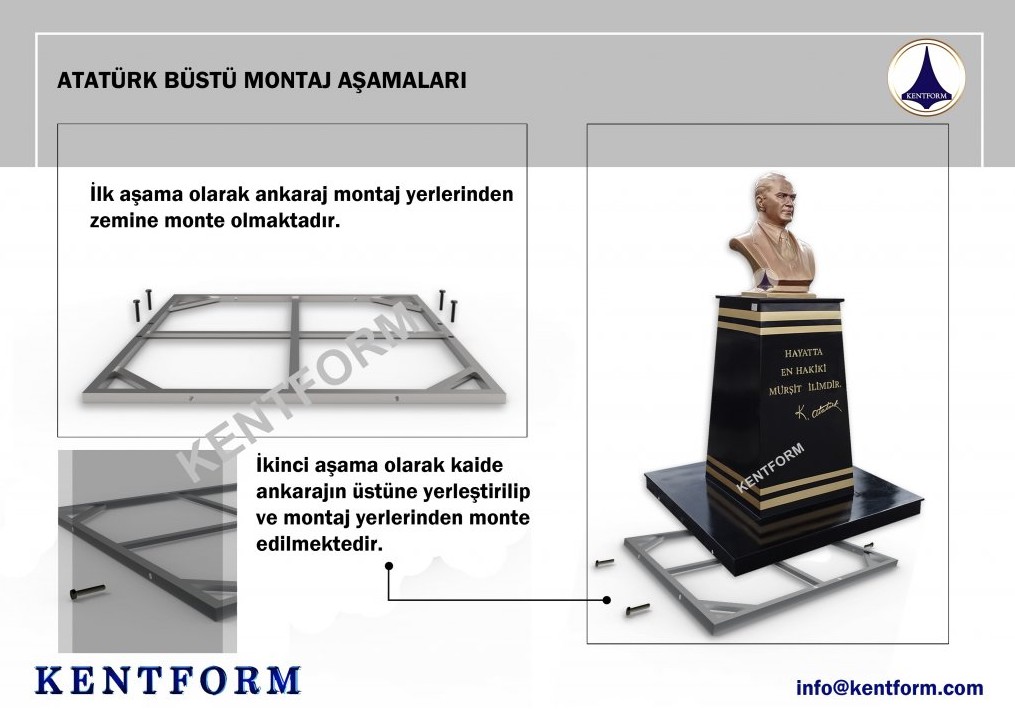 Bu model; büst, kaide, platform ve montaj ekipmanları ile birlikte tek set halinde sunulmakta olup, resmi kurumlar ve eğitim alanları için ideal bir anıt çözümüdür.