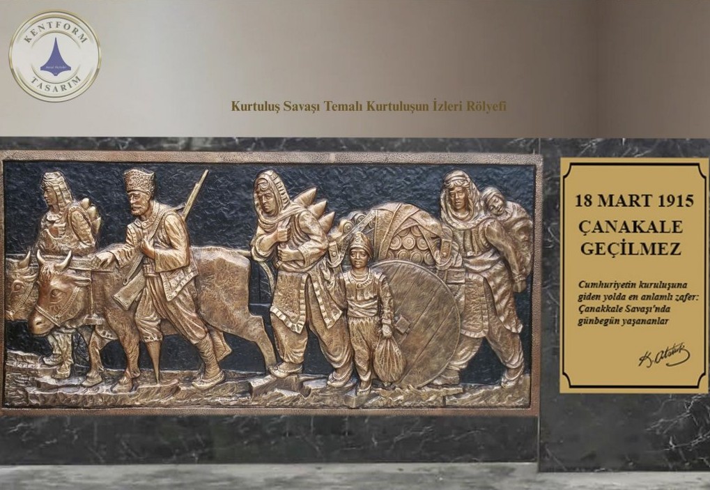 Türk milletinin bağımsızlık yolunda verdiği büyük mücadeleyi ve Kurtuluş Savaşı’nın ruhunu yansıtan bu özel rölyef çalışması, tarihsel anlatımı güçlü bir kompozisyon ile sanatsal forma dönüştürmektedir.