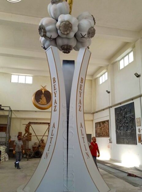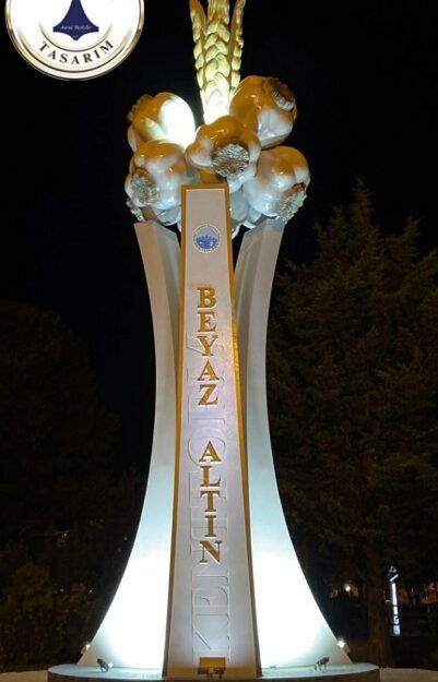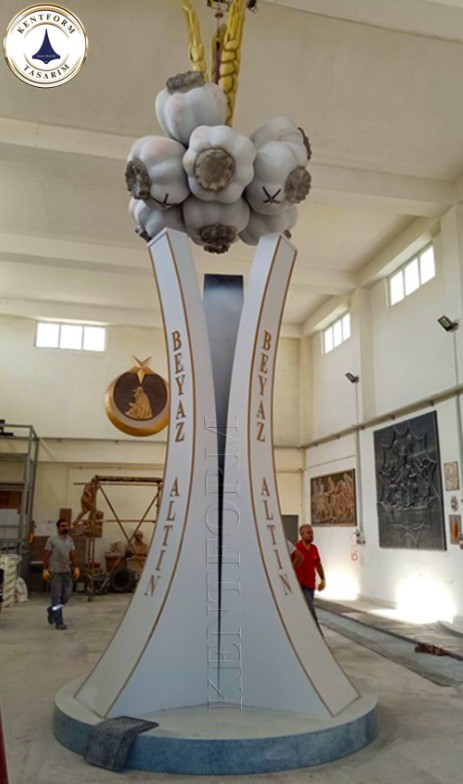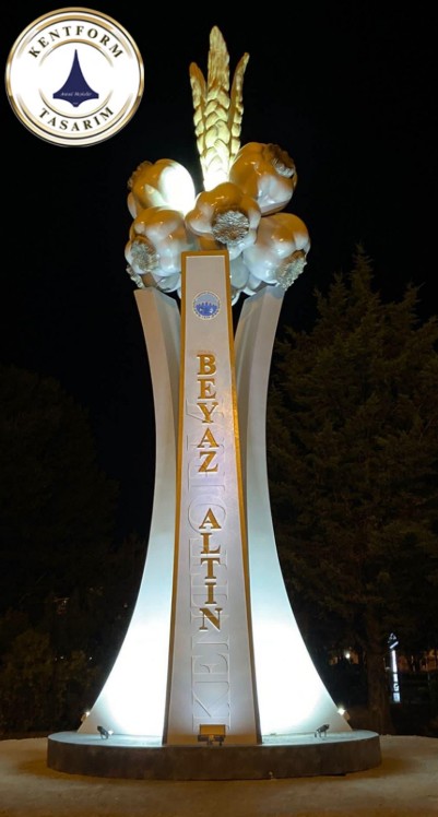 Heykelde yer alan sarımsak formu; doğal yapısına uygun olarak detaylı biçimde modellenmiş, ürünün karakteristik görünümü estetik bir kompozisyon ile ön plana çıkarılmıştır. Figüratif anlatım ile tasarlanan bu çalışma, yöresel değerin kent kimliği ile bütünleşmesini sağlamaktadır.