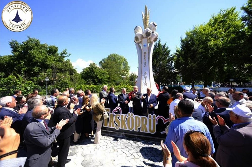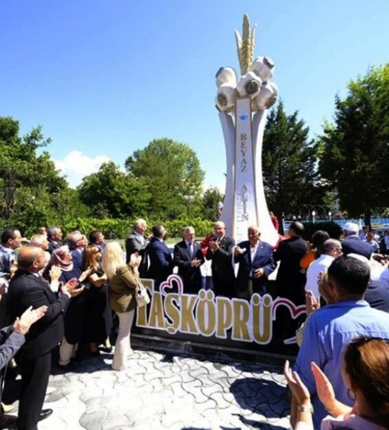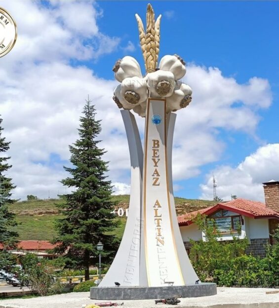 Coğrafi işaretli Taşköprü sarımsağının simgesel değerini ve bölgesel kimliğini yansıtan bu anıt heykel çalışması, kente özgü üretim kültürünü güçlü bir görsel anlatımla ifade etmektedir.
