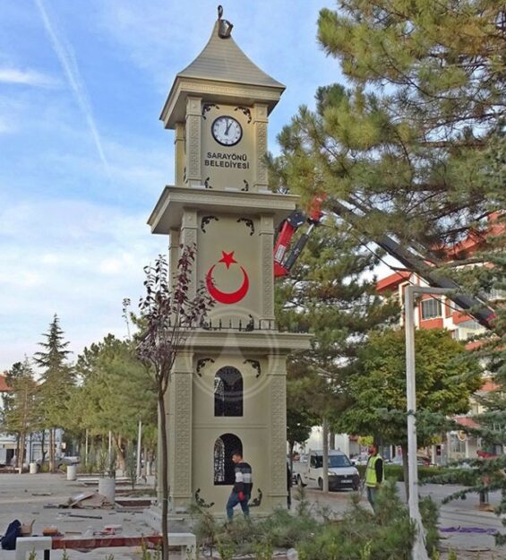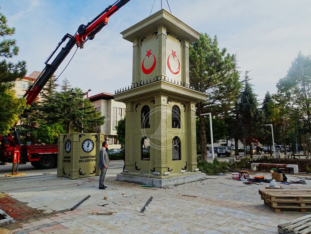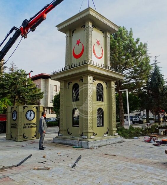 Saat kulesinin yüzeyinde yer alan Osmanlı motifleri ve dekoratif sütun detayları, tarihsel mimari anlayışı modern üretim teknikleriyle buluştururken; kuleye entegre edilen Türk bayrağı formları projeye milli bir karakter katmaktadır.
