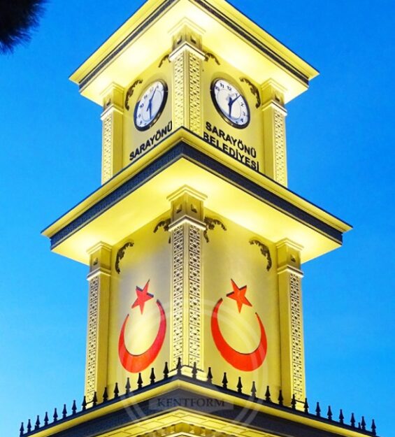 Geleneksel Osmanlı mimarisinden ilham alınarak tasarlanan bu özel saat kulesi, Türk bayrağı formu ile zenginleştirilmiş estetik detayları sayesinde bulunduğu alana güçlü bir kimlik kazandırmaktadır. Anıtsal ölçekte geliştirilen yapı, hem fonksiyonel bir şehir elemanı hem de görsel açıdan dikkat çekici bir simge niteliğindedir.